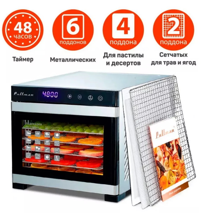 Количество поддонов6 (4 для пастилы + 2 сетки для мелких продуктов)