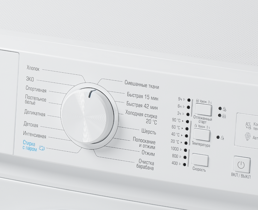 Программы: хлопок; деликатная; интенсивная; смешанные ткани; быстрая 42/15 мин.; холодная стирка 20С; Отжим; Шерсть; полоскание и отжим; очистка барабана. Эко; детская; постельное белье; Спортивная; стирка с паром.