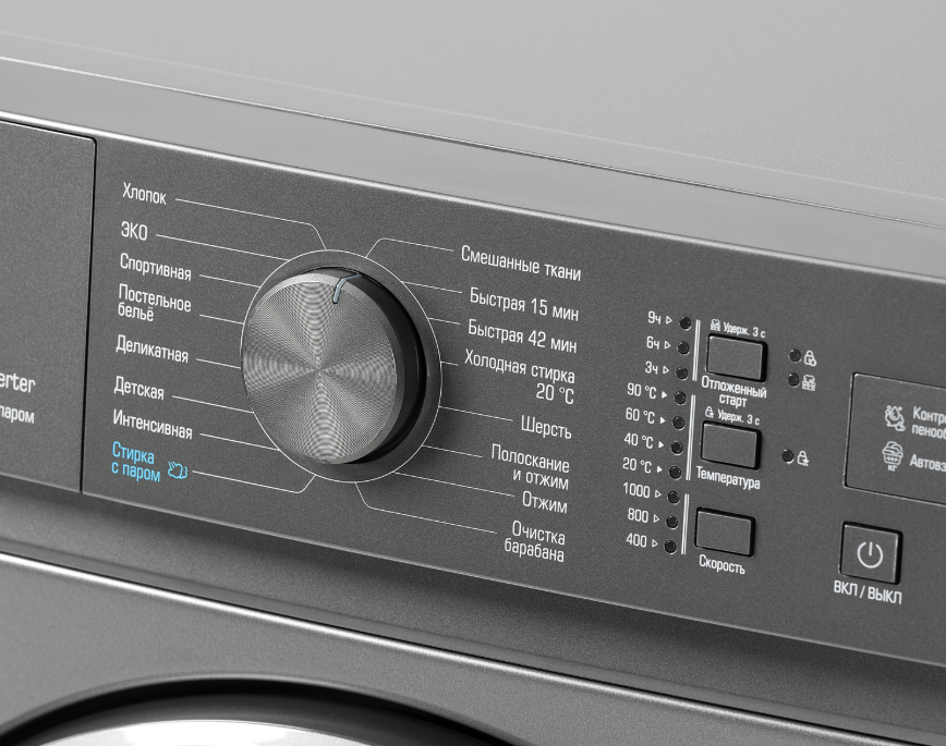 Программы: хлопок; деликатная; интенсивная; смешанные ткани; быстрая 42/12 мин. холодная стирка 20С; отжим; шерсть; полоскание и отжим. Эко, детская; постельное белье; спортивная; стирка с паром.