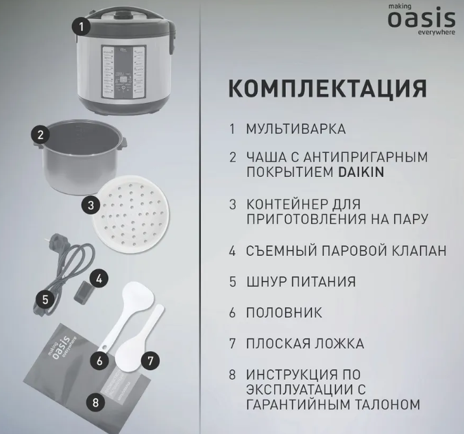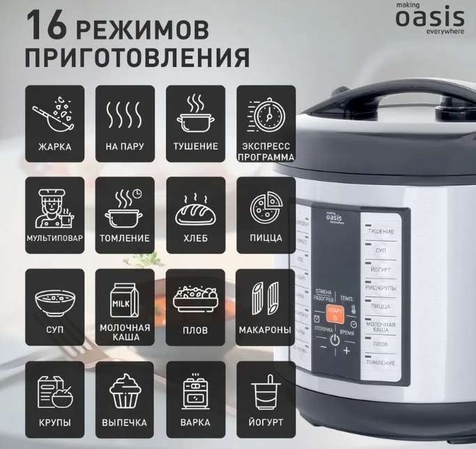Автоматические программы: жарка; суп; на пару, тушение; экспресс программа; мультиповар; томление; блеб; пицца, плов; молочная каша; макароны; крупы; выпечка; варка; йогурт.