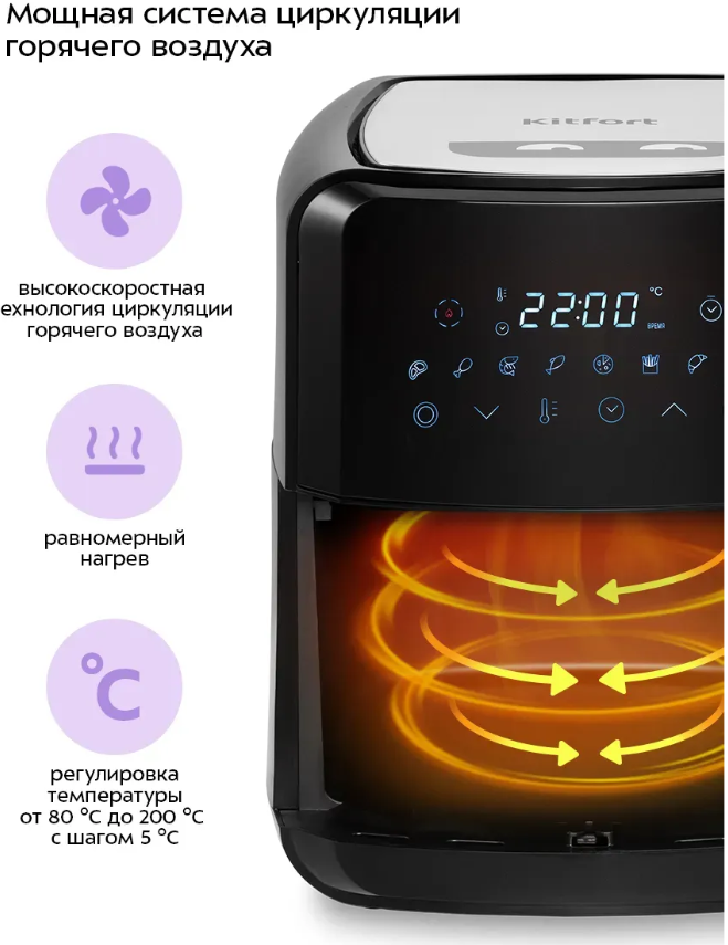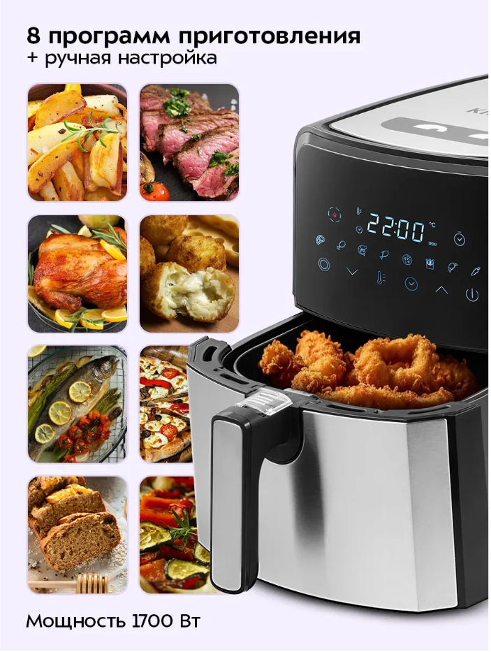 Программы приготовления: пицца, картофель фри; выпечка; сушка овощей и фруктов; мясо/стейк; птица; морепродукты, рыба.